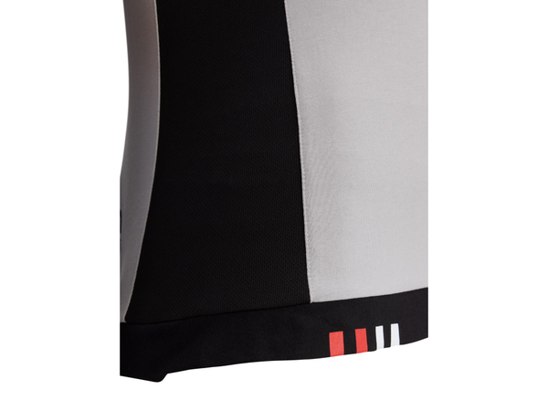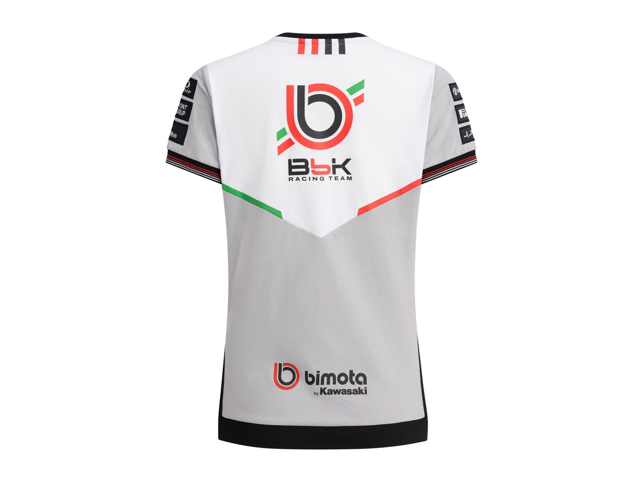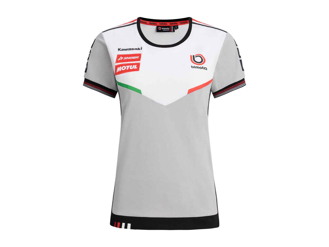 Kortärmad t-shirt med rund halsringning, där ärmsluten har ribbade muddar i rött och vitt, och nederkanten pryds av röda och vita Bimota-markeringar.