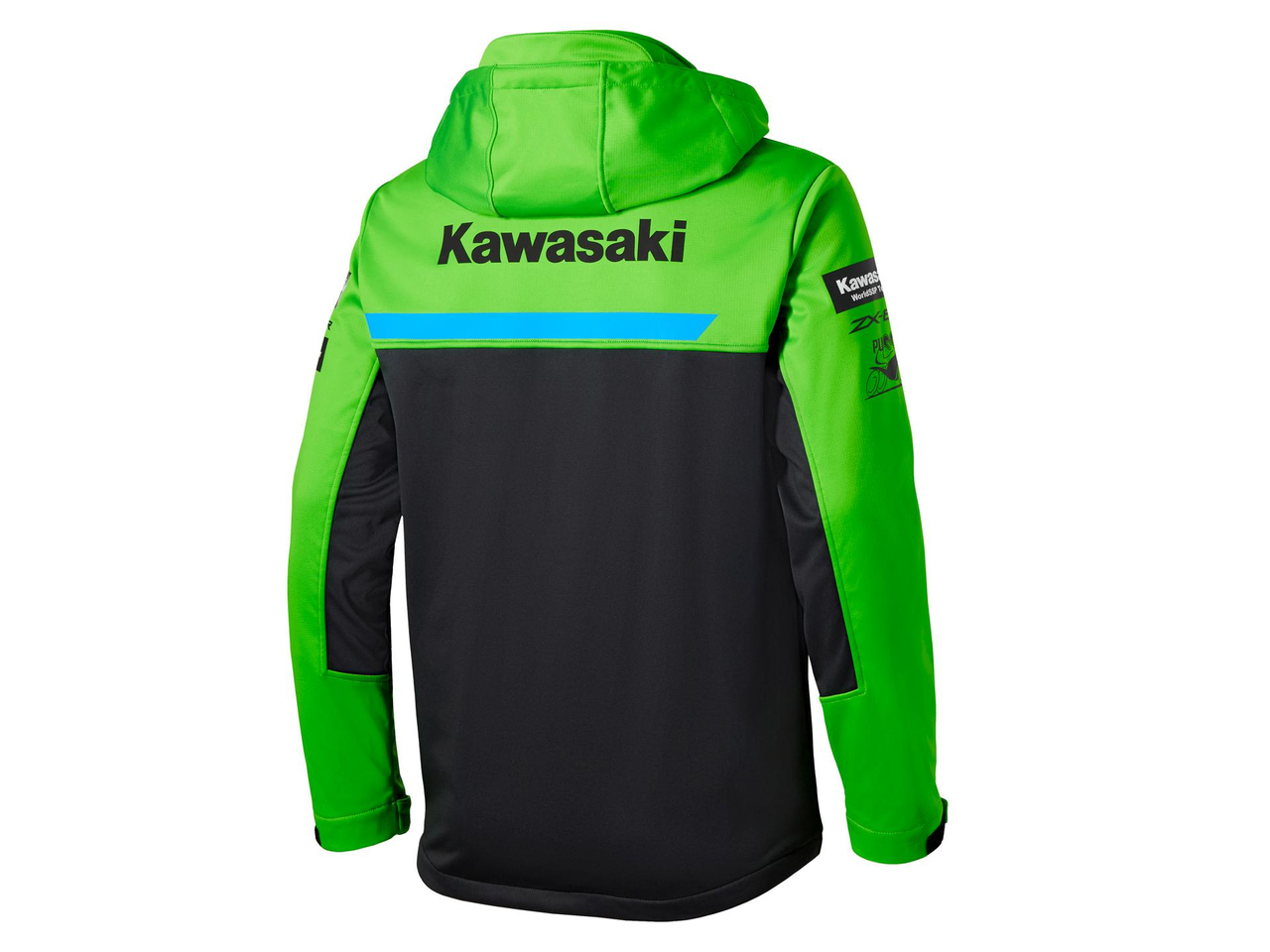 Softshelljacka i Kawasaki WSBK Team-färger. Den har ytterfickor med dragkedja och justerbara muddar.