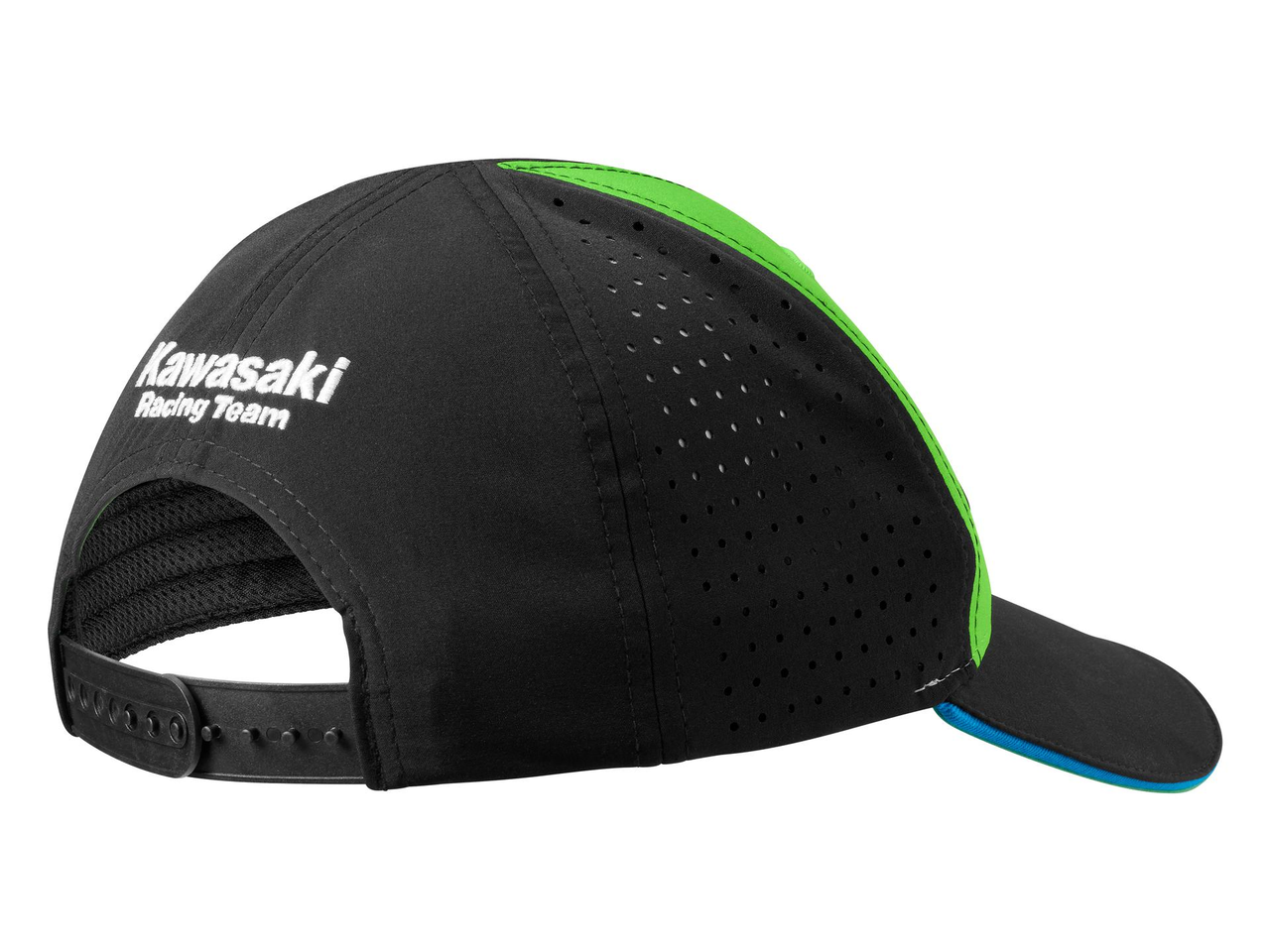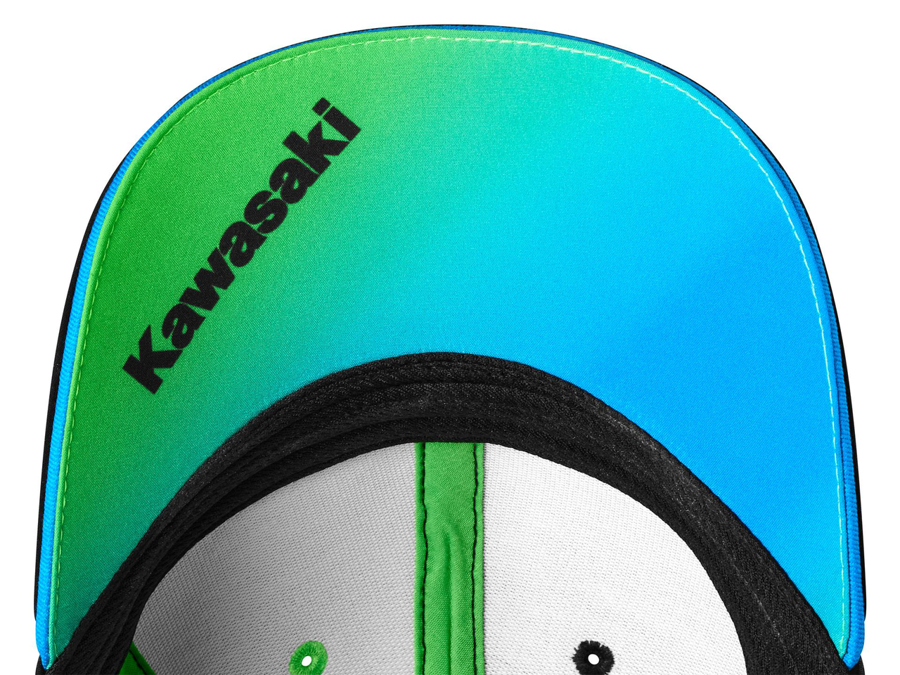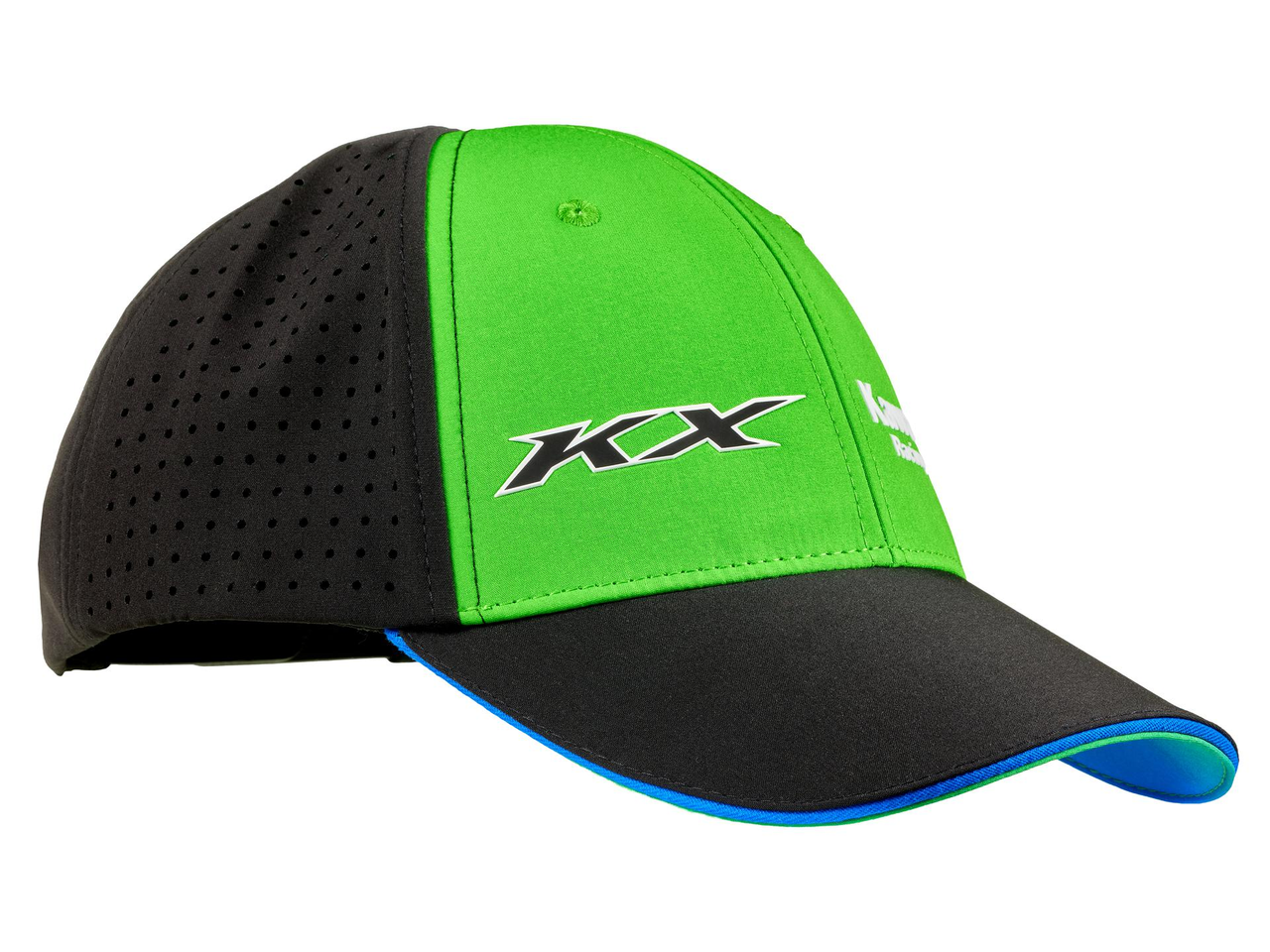 Keps med sex paneler och böjd skärm, med ventilerande sidopaneler i Kawasaki MXGP-teamets färger.
