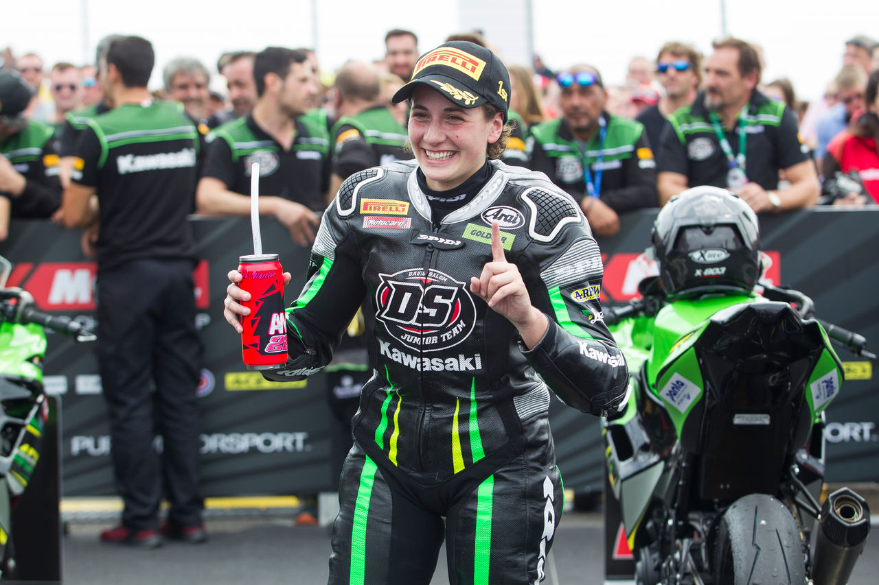 Spola fram till 2018, det första året med Ninja 400, och det blev en helt enkelt episk säsong för Carrasco, för kvinnor inom motorsporten, för Kawasaki och för roadracingens profil i stort. Genom att gå från racevinnare året innan till världsmästare – med endast en poängs marginal – i den svåra finalen på Magny-Cours 2018, blev Carrasco den första kvinnan någonsin att vinna ett helt öppet FIM-mästerskap i roadracing.
