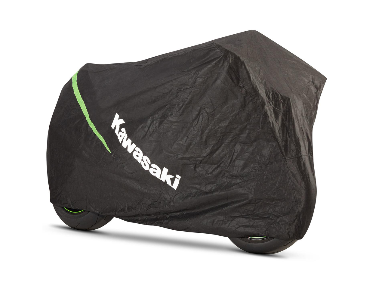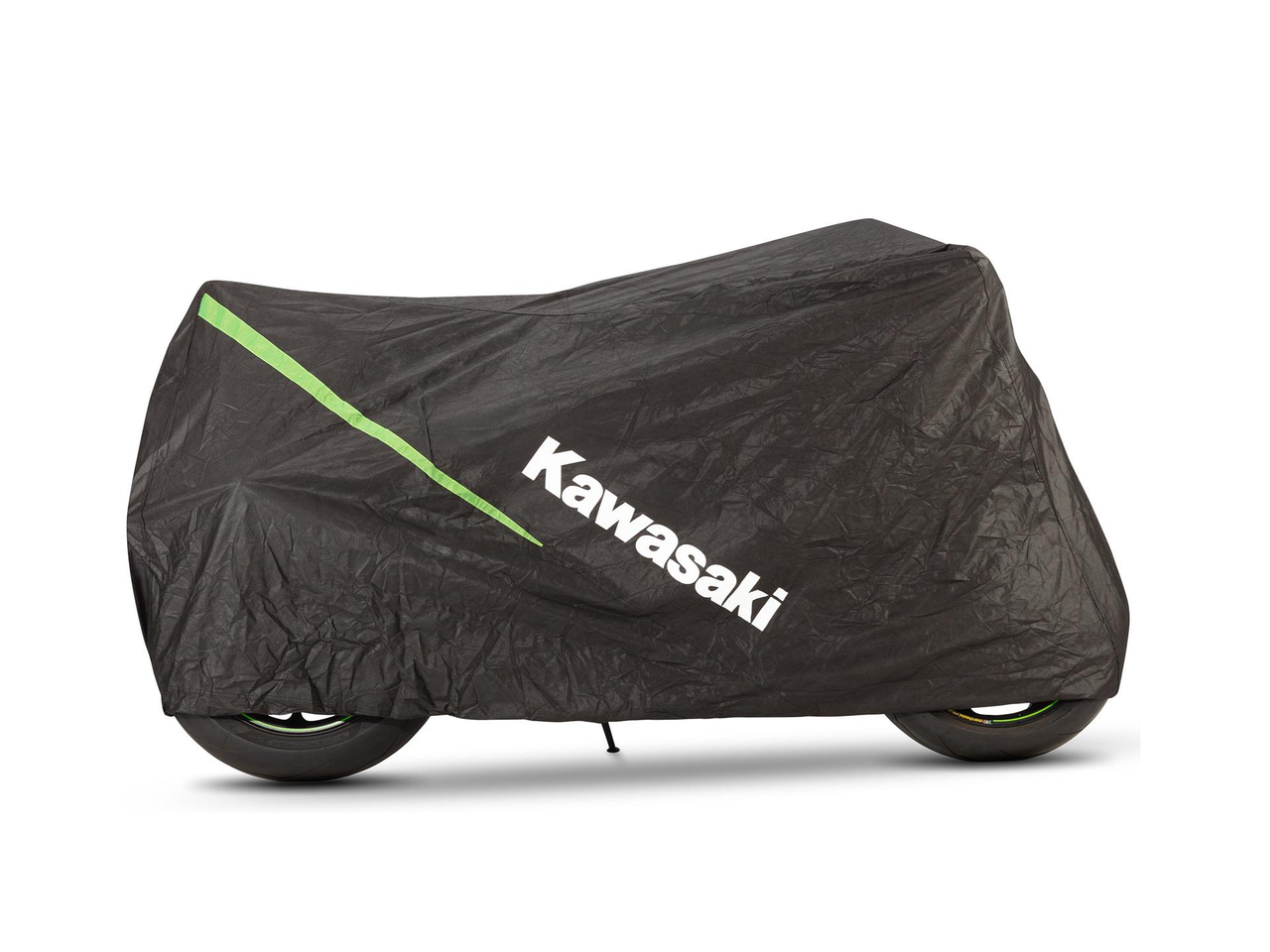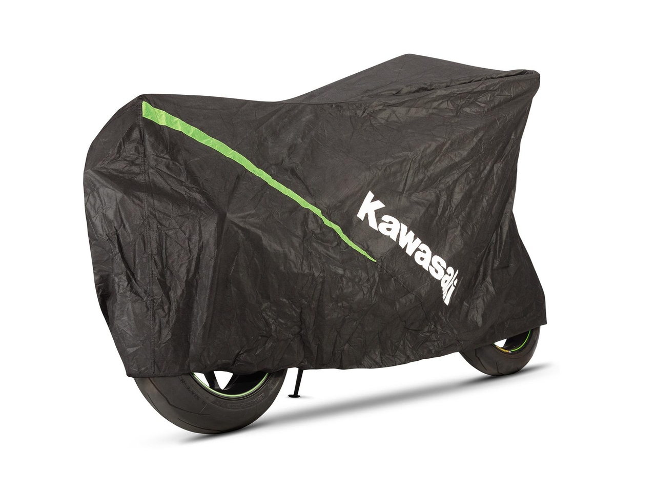 Motorcykelskydd tillverkat av andningsbart, slitstarkt icke-vävt ripstop material. Kawasaki-specifik med gröna honeycomb-designelement. Lättåtkomligt låsspänne. 100 % polyester. Med en fleranvändbar förvaringspåse.